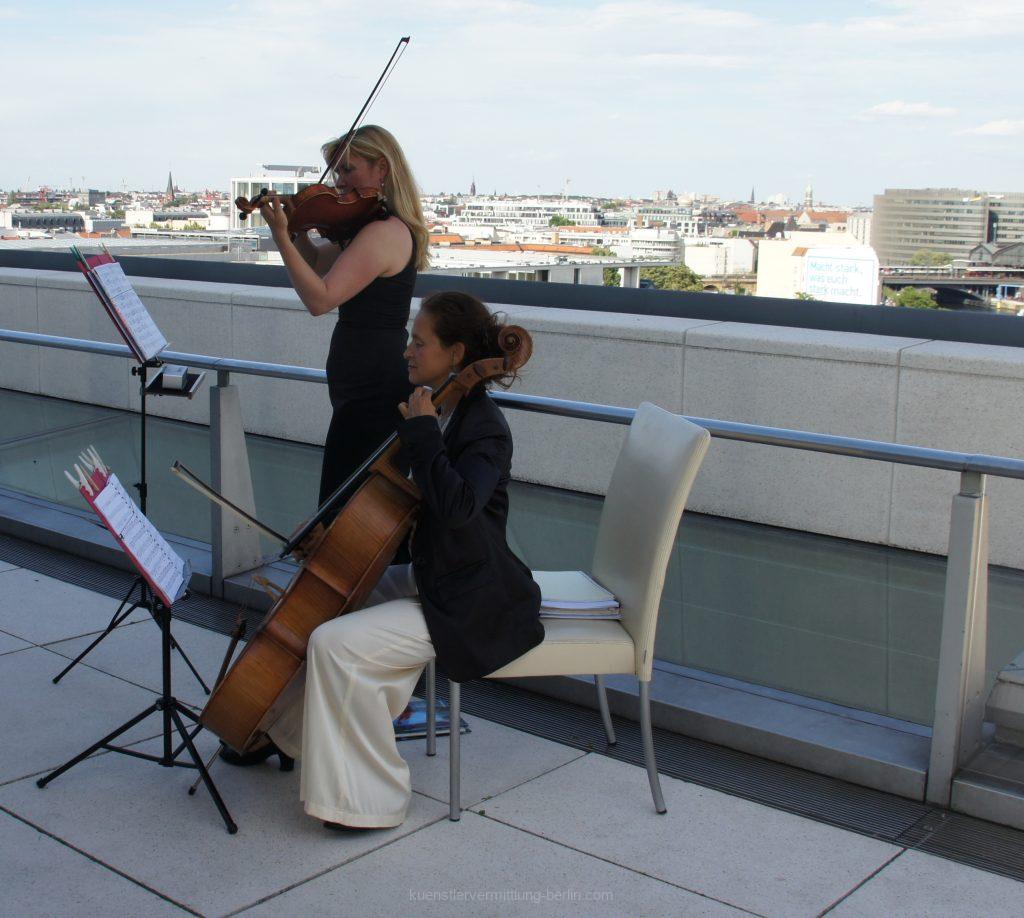classical violin duo welcomes international guests on the terrace of the Reichstag at 30 degrees bright sunshine and a fantastic view over Berlin.