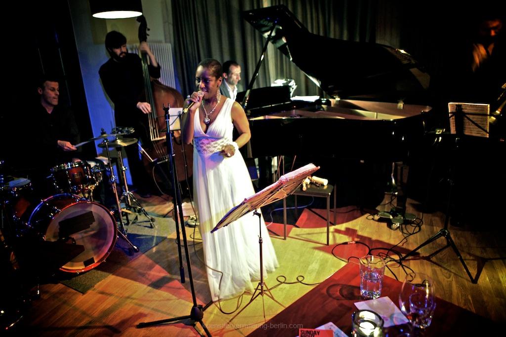 Soul und Partystimme. Mit ihrer ausdrucksstarken Stimme vereint die Sängerin in Berlin ihre Liebe zum Jazz und Soul. Solo oder mit 2 Tänzerinnen, präsentiert Sie bekannte Party-Hits aller Zeiten. Begleitet von Piano und Saxophon singt sie weltberühmte Balladen. Mit einem umfangreichen Repertoire für die kleine private Feier oder einen Firmenevent, mit viel Energie schafft sie es in kurzer Zeit die Gäste von den Stühlen zu reißen. Die Show kann als Higlight des Abends oder als Entertainment bei Gala-Dinners – auch mit Coverbands eingesetzt werden. Eine der meistgebuchten Sängerinnen in Berlin.
